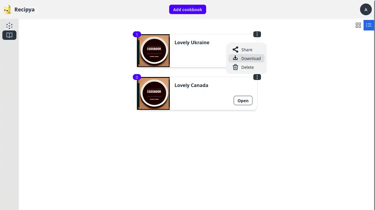 To download a cookbook, first click the three vertical dots at the top right of the cookbook you wish to download. Then, click the Download submenu item. The file will be downloaded immediately.