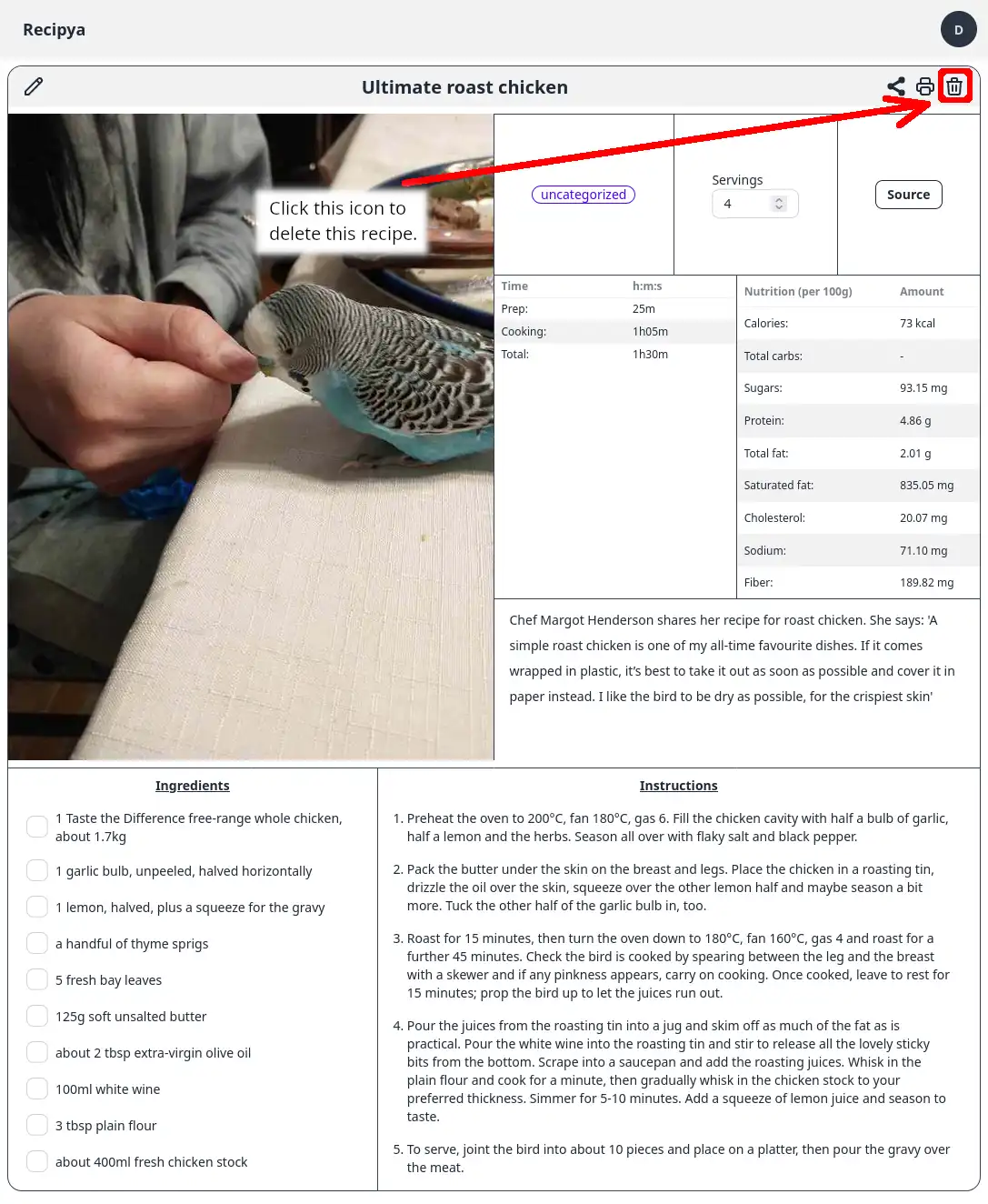 To delete a recipe from your collection, you first must view a recipe. Then, click the trashcan icon to the right of the recipe’s title. You will be prompted whether you want to proceed before deletion.