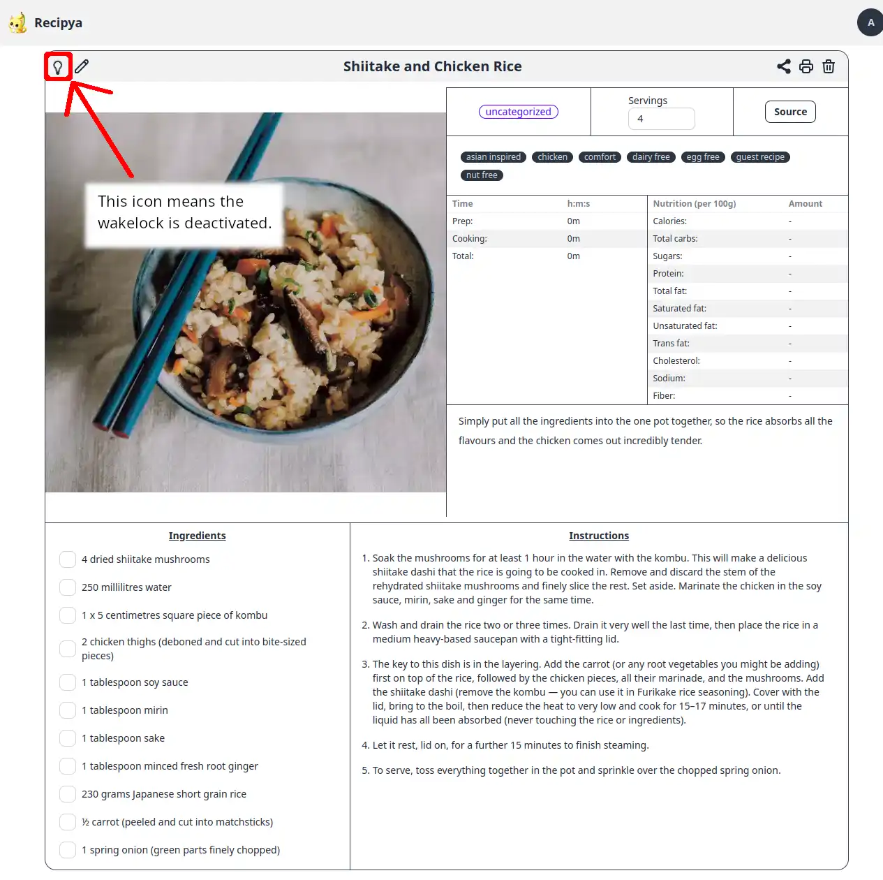 On supported browsers, you will notice a light bulb icon to the far left of a recipe’s title. When the light bulb is on, the wakelock is enabled and the screen will not sleep.